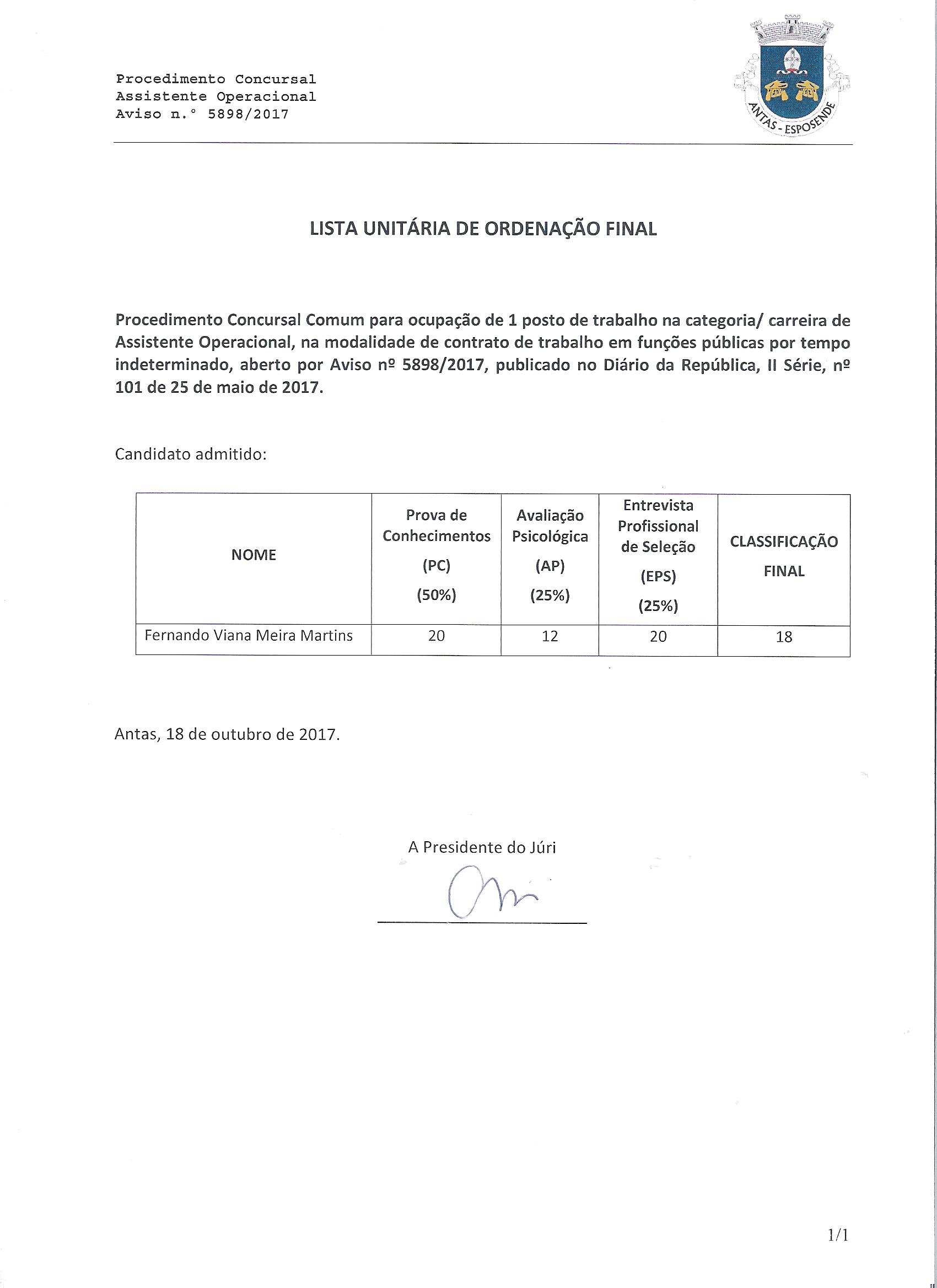 Procedimento concursal comum para constituição de relação jurídica de emprego público, na modalidade de contrato de trabalho por tempo indeterminado, para um posto de trabalho, na carreira/categoria de Assistente Operacional.